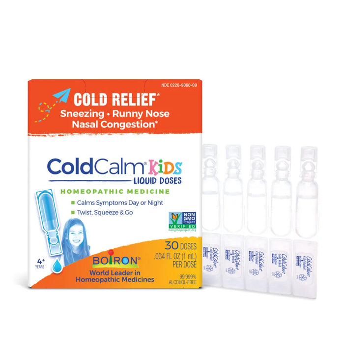 When youngsters are sick and fussy with a cold, relief is just a squeeze away. ColdCalm® Kids Liquid Doses by Boiron work to relieve sneezing, runny nose, nasal congestion, and occasional minor sore throat.* This non-GMO children’s cold medicine comes in hygienic, individual doses that are easy to use. Just twist to open the pre-measured dose and squeeze the liquid into your child’s mouth. Recommended for children 4 years of age and older.
