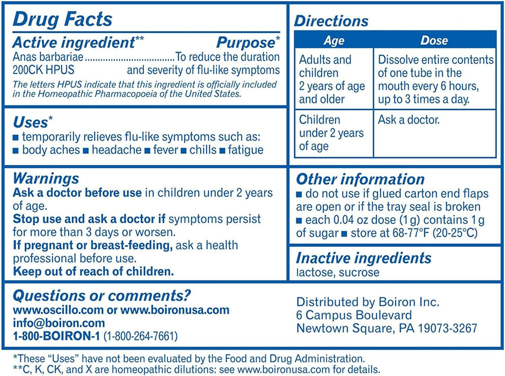 The moment you feel achy or run down, take Boiron Oscillococcinum and feel like yourself again. Trusted as Nature’s #1 flu medicine, Oscillococcinum has been shown in clinical studies to reduce the duration and severity of flu-like symptoms such as body aches, headache, fever, chills, and fatigue.* Easy to take, the meltaway pellets dissolve in the mouth and are recommended for everyone ages 2 and up.