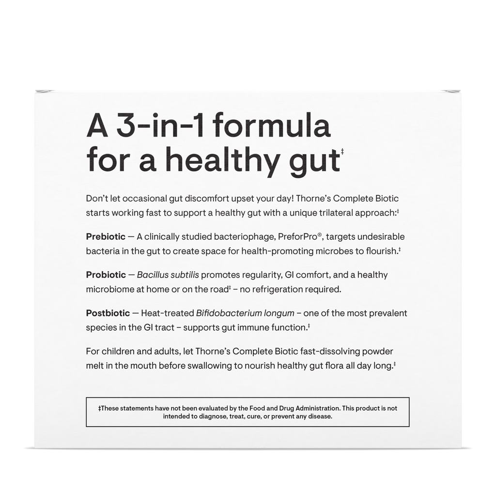 Just one stick pack of Complete Biotic each day provides extensive support for a healthy microbiome with well-studied -biotics to benefit bowel regularity, stool consistency, intestinal comfort, and growth of beneficial bacteria in favor of less beneficial bacteria.*