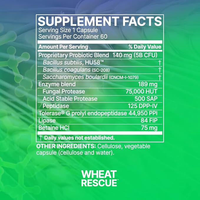 WheatRescue™ is a unique blend of powerful digestive enzymes and probiotics designed to support optimal gluten digestion and protect against hidden sources of gluten. DPP-IV and Tolerase G® are specific enzymes that assist in the breakdown of glutenin and gliadin proteins, which can help alleviate symptoms associated with dietary gluten intolerance and sensitivity. WheatRescue™ combines resilient probiotic spores with superior digestive enzymes to support the complete digestion of gluten and other inflammatory wheat-derived peptides within 60 to 90 minutes.